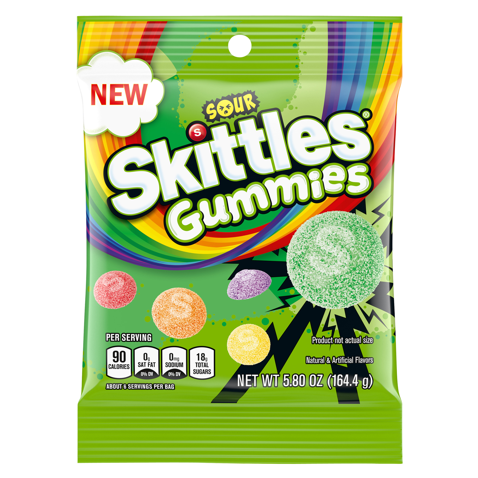 STOP SCROLLING! You asked for SKITTLES Gummies - We said "Let's Do It!" Now, we are taking fruity chewy candy deliciousness to the next level with all NEW SKITTLES Sour Gummies. Enjoy everything you love about SKITTLES Sour candy now in chewy gummy candy form. A soft and fruity mix of sour strawberry, sour green apple, sour lemon, sour orange, and sour grape flavored chewy candy assortment. Each SKITTLES Sour Gummie is dime-sized, provides a highly satisfying chew (especially when you eat more than one at a time), and the sour to gummy candy ratio is spot on. Forget boring gummy bears and gummy worms, find gummy candy awesomeness with soft and fruity SKITTLES Sour Gummies. Grab a pack of this chewy sour candy and enjoy a NEW assorted gummy candy experience. Bring them along when road-tripping or taking a break from studying. You might even refresh your family movie night and game day treats with NEW SKITTLES Sour Gummie candy packs. Add this 5.8oz pack to your shopping list today and Taste the Sour Side of the Gummie Rainbow.